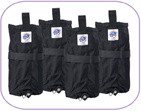 Set of four nylon bags hold 40 lbs. of sand each and wraps around E-Z UP® shelter leg with Quick Attachment strap. Quick Release pins are included to attach weight bag to leg. Works on hard or soft surfaces.